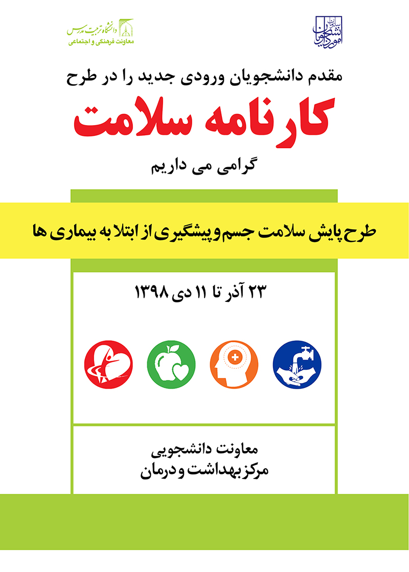۱- مراجعه به سایت https://portal.saorg.ir/physicalhealth و پر کردن پرسشنامه سلامت جسم به شرح ذیل: * ابتدا وارد لینک زیر شوید: (https://portal.saorg.ir/physicalhealth). در صورتی که در پروسه ثبتنام با مشکل مواجه شدید، شماره تلفن ۸۸۶۳۴۱۶۴ و یا شماره موبایل ۰۹۳۹۰۲۶۵۴۷۵ پاسخگوی سوالات شما عزیزان خواهد بود. * در سایت مربوطه بر روی گزینه ثبتنام کلیک کنید؛ * مراحل ثبت نام در سایت به شرح ذیل میباشد: ۱- قوانین و مقررات را خوانده و در قسمت مربوطه تیک تأیید را بزنید؛ ۲- مشخصات خود را وارد نمایید و به مرحله بعدی بروید؛ ۳- تأییدیه ثبتنام به صورت دو کد از طریق پیامک و ایمیل به شماره موبایل و آدرس ایمیل شما ارسال خواهد شد. هر دو کد ارسال شده به صورت ایمیل و پیامک را در کادرهای مربوطه وارد نمایید. این دو کد متفاوت هستند بنابراین باید هر دو کد را دریافت و وارد نمایید؛ ۴- در صورت عدم ارسال کد به صورت پیامک باید بر روی گزینه تماس کلیک نمایید، با شما به طور اتوماتیک تماس گرفته خواهد شد و کد شما اعلام میشود؛ ۵- در آخر صحت اطلاعات وارد شده را تایید کنید؛ ۶- سپس بر روی " کارنامه سلامت جسم" کلیک کنید تا وارد بخش کارنامه سلامت شوید. * تکمیل کردن فرمهای کارنامه سلامت شامل ۴ مرحله میباشد: ۱- موافقت با قوانین و مقررات ۲- وارد کردن مشخصات عمومی ۳- پاسخگویی به سوالات مرتبط با سلامت ۴- وارد کردن سوابق پزشکی * بعد از تکمیل پرسشنامه، اقدام به چاپ خروجی کارنامه سلامت جسم خود نمایید. ۲- مراجعه به مرکز بهداشت و درمان برای انجام معاینات بالینی بر اساس زمانبندی اعلام شده: تکمیل پروسه طرح سلامت دانشجویان ورودی جدید نیاز به معاینات پزشک و دندانپزشک و اندازه گیری فشار خون و قد و وزن توسط پرستار دارد، با همراه داشتن نسخه پرینتِ کارنامه سلامت جسم و دفترچه بیمه خود در تاریخهای معین شده به تفکیک دانشکدهها، به مرکز بهداشت و درمان دانشگاه تربیت مدرس به آدرس ضلع جنوبی دانشگاه تربیت مدرس؛ خیابان سیندخت؛ کوچه شهریور؛ پلاک ۷۷ مراجعه کنید. ساعت مراجعه: از ۸:۰۰ صبح تا ۱۵:۰۰ عصر جدول زمانبندی مراجعه به مرکز بهداشت و درمان برای انجام معاينات بالينی