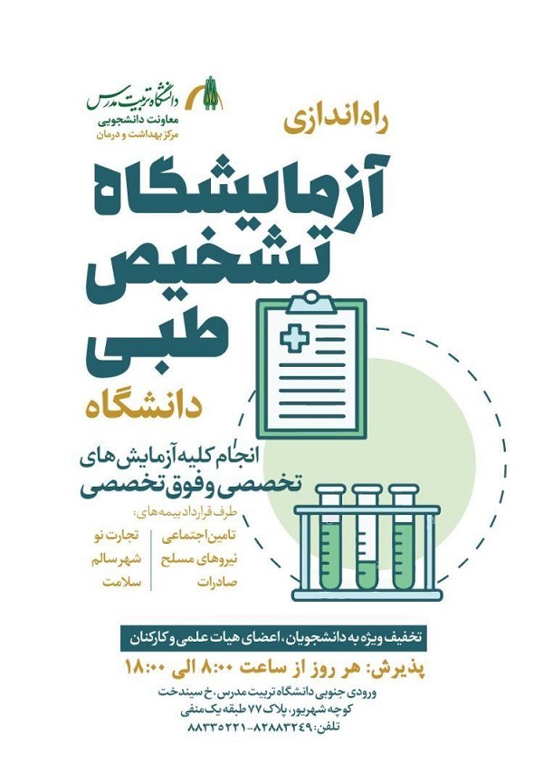 ![]() خلاصه خبر: آزمایشگاه تشخیص طبی در محل درمانگاه دانشگاه، هر روز از ساعت ۸:۰۰ الی ۱۸:۰۰ دایر میباشد. با پیگیری مدیر مرکز بهداشت و درمان و هماهنگیهای انجام شده، آزمایشگاه تشخیص پزشکی در محل درمانگاه دانشگاه، هر روز از ساعت ۸:۰۰ الی ۱۸:۰۰ دایر میباشد.