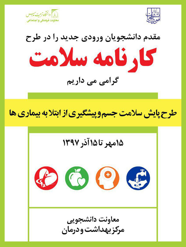ضمن عرض تبریک به شما عزیزان برای پیوستن به جامعه دانشجویی دانشگاه تربیت مدرس امید است مرکز بهداشت و درمان بتواند با ارائه خدمات مورد نیاز شما در حوزه بهداشت و سلامت با ایجاد حس رضایت در شما در موفقیتهای علمی شما نقشآفرین باشد.