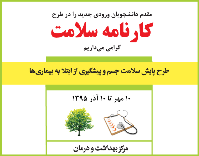 مرکز بهداشت مقدم دانشجویان عزیز جدیدالورود را در طرح پایش سلامت جسم و پیشگیری از ابتلا به بیماریها از ١٠مهر تا ١٠ آذر ١٣٩٥ گرامی میدارد.